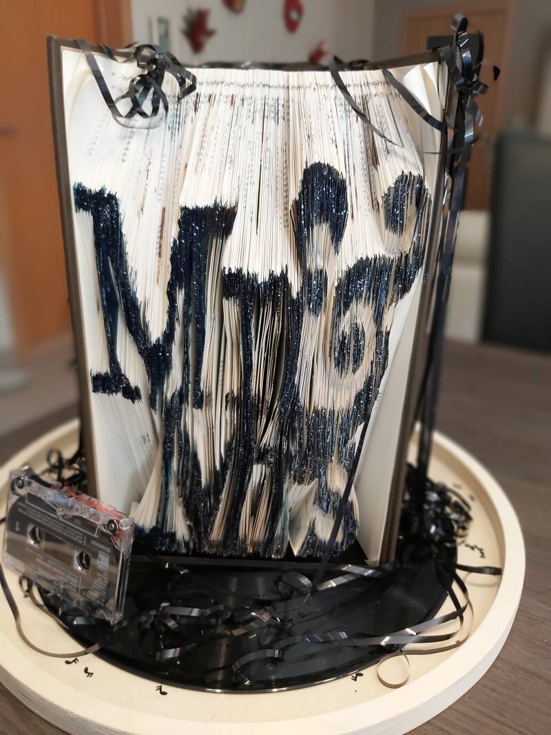 Dit boek werd op een dienblad gedecoreerd samen met een oude muziekplaat en een retro-cassetje.