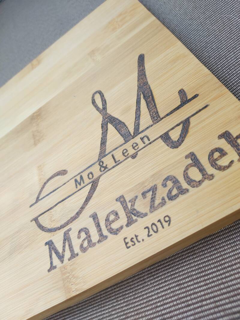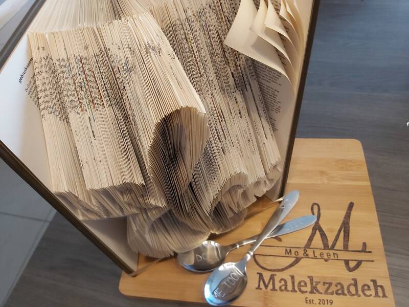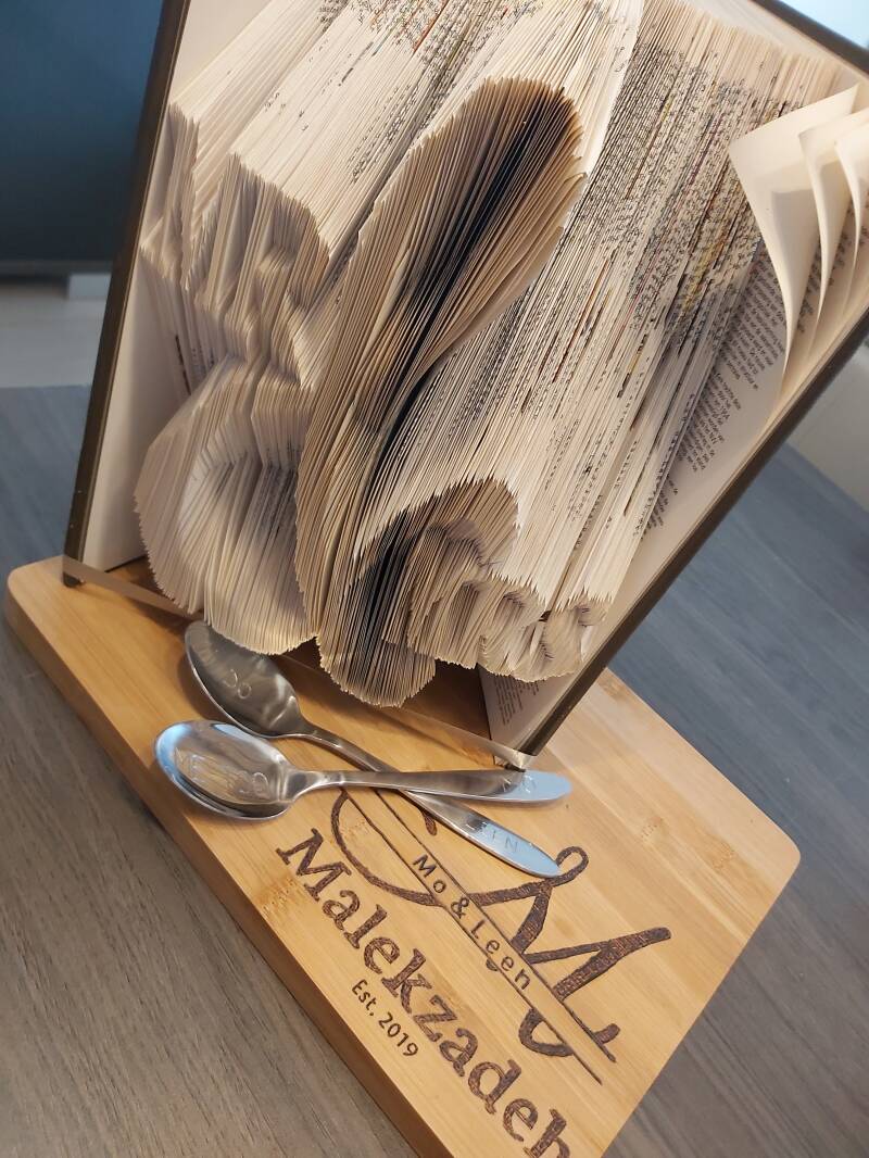 Het boek werd nadien op een snijplank gedecoreerd dat ook nog eens gepersonaliseerd was door hun naam hierin te branden.